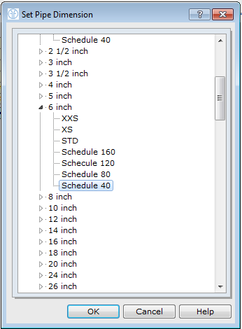 This opens the steel pipe database. Expand the 6 Inch field to view the classifications and select schedule 40. Figure 2.1.10 shows the steel pipe database including available sizes.