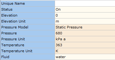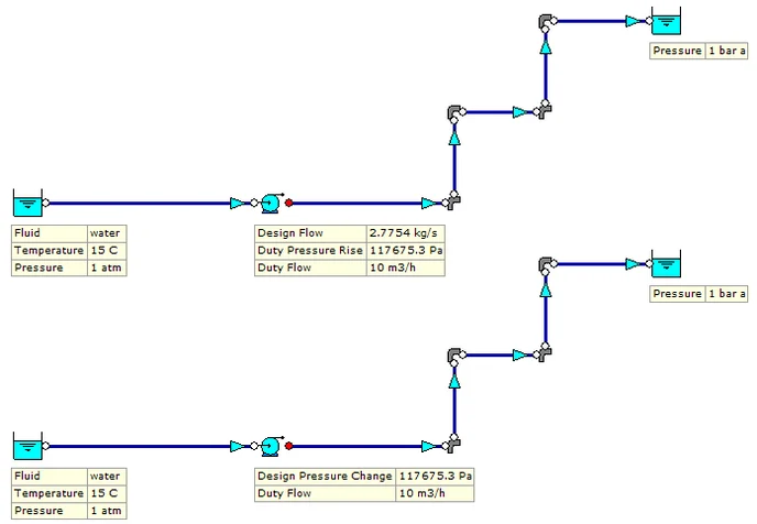 The example in Figure 4.1.1 demonstrates both approaches. Both models show a pumped system transporting water at 15oC and 1 atm pressure to an outlet with a design pressure of 1 bara via a network of 50 mm pipes. The pump in the top model is sized based on a design flow rate of2.7754 kg/s. Based on the design conditions and engineering conditions which apply, the calculated duty pressure rise is 117675.3 Pa (12.0 m fluid).