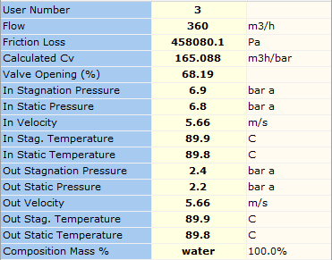 The following example case is derived from Example 1, Appendix E of ISA-75.01.01-2007. This system is based on incompressible flow of fluid (water) with a temperature of 363 K, density of 965.4 kg/m3, inlet and outlet absolute static pressure of 680 and 220 kPa a respectively and a flow rate of 360 m3/h.