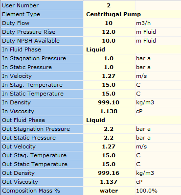An overview of some pump results for automatically sized pumps are shown in Figure 4.1.2. Note, when we model a vendor pump in our system, the software also calculates the duty power requirement, efficiency and NPSHr. You can also model changes in pump speed and impeller diameter thus helping you optimise your system performance.