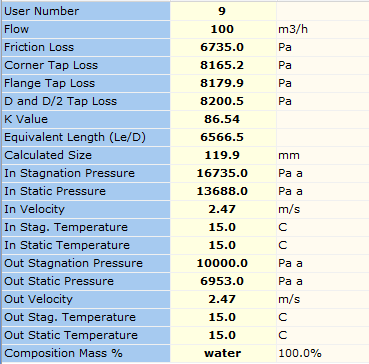 The results for flange tap loss, D and D/2 loss, corner tap loss along, friction loss and associated k value are all automatically calculated for orifice plates.