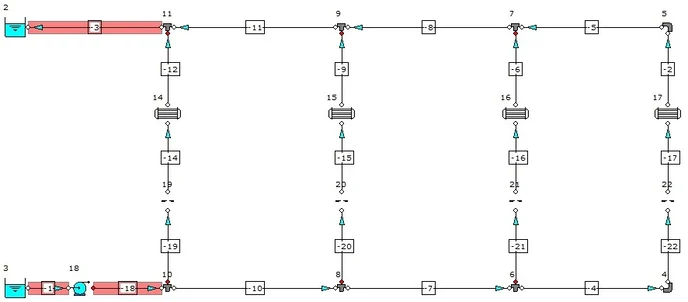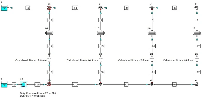This example involves designing a cooling water distribution system to a bank of heat exchangers where we shall use orifice plates to balance the flow distribution. We shall also use the auto sizing functions to develop the system design and size the pipes, pump and orifice plates.