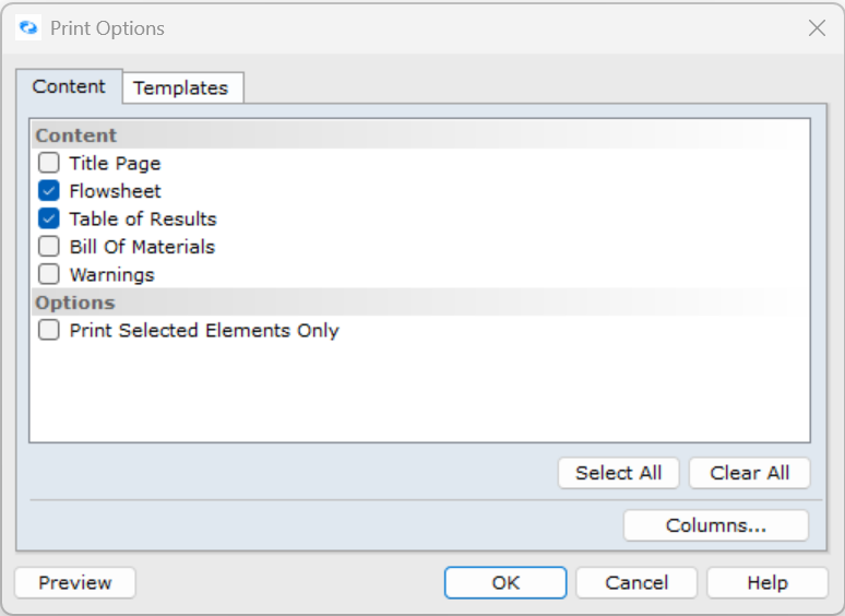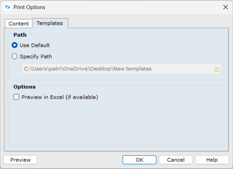 - In the Print Options window, select the Templates tab
