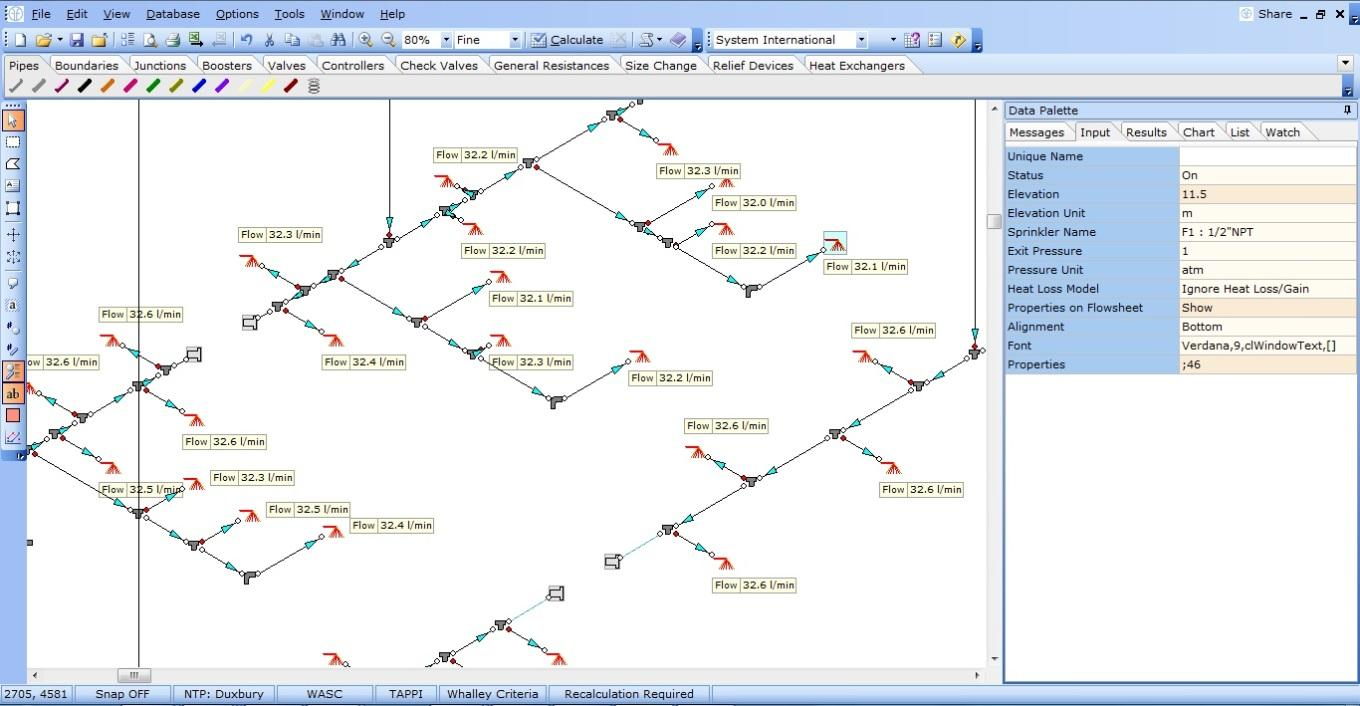 The designer was required to establish flow distribution throughout the system, pressure losses, pressure available at outlet nozzles and review pipe velocity levels to ensure they were in compliance with the requirements of NFPA – Standard for the Installation of Sprinkler Systems.