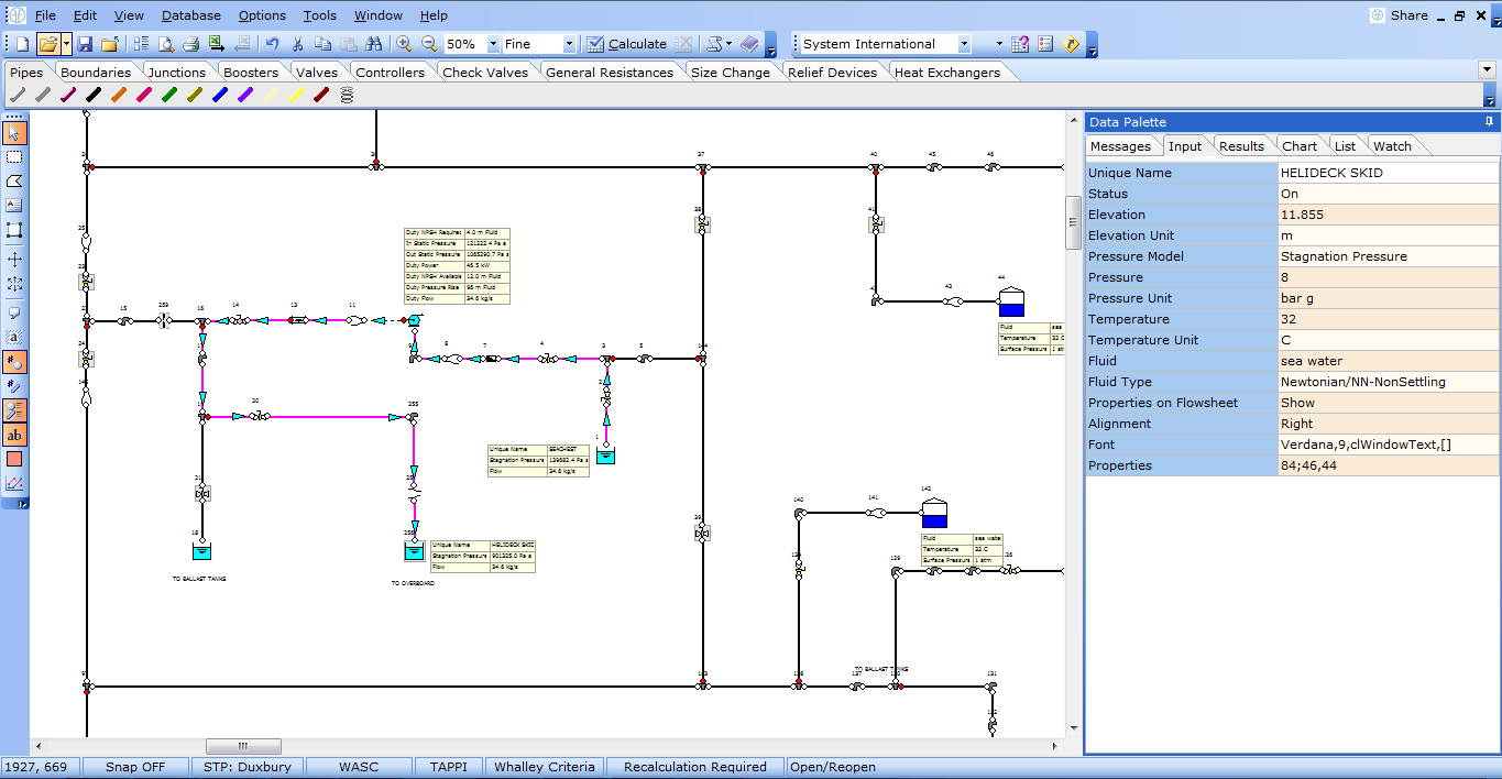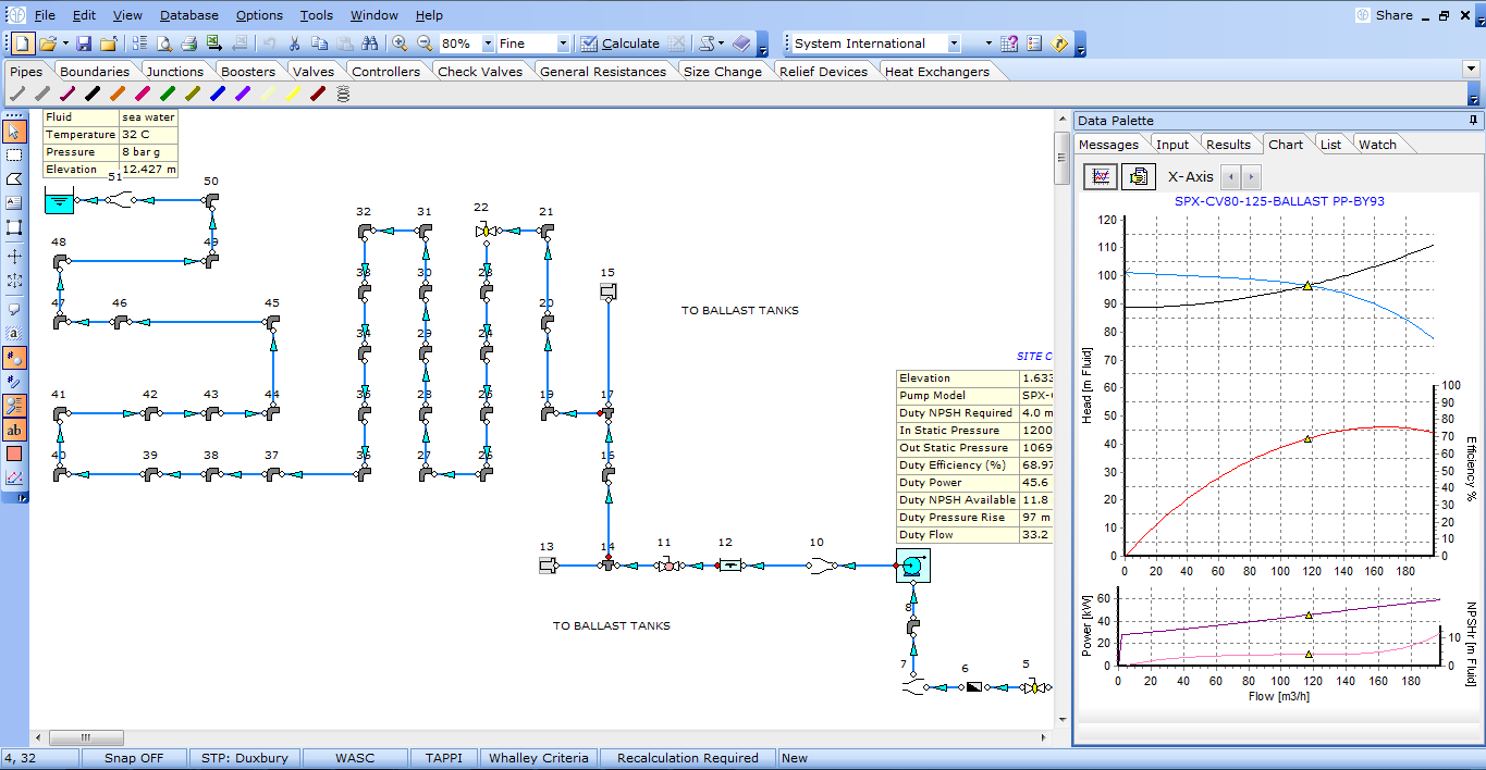 The vessel had an existing ballast pump which was capable of 150 m3/hr at 9 bar. The team at Cochin Shipyard Ltd checked the suitability of the existing pump for this upgraded application using FluidFlow. The re-worked pipes and fittings were modelled together with pump performance data which was provided by the pump manufacturer.