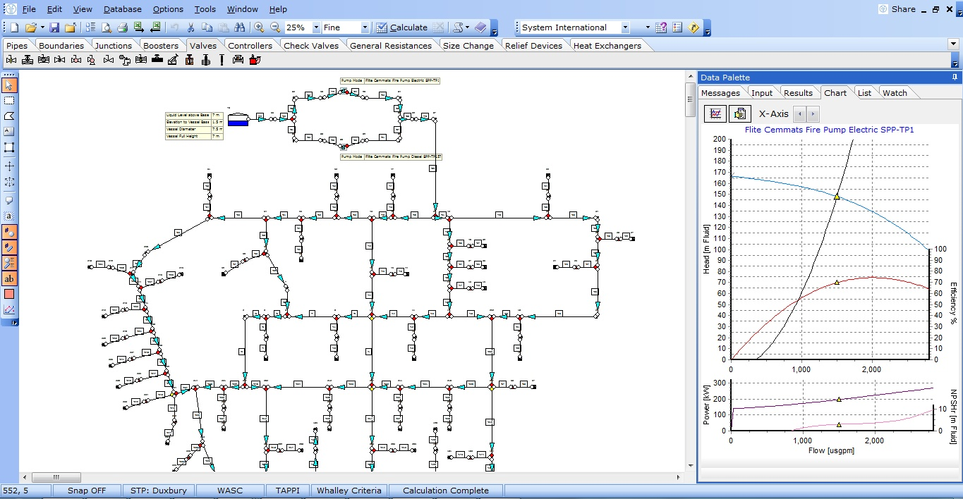 Modeling this system using FluidFlow allowed the designer to develop a detailed insight into the operating performance of the plant and also quickly identify any pipe velocities which exceeded the design value of 20 ft/s as set out in the NFPA Guide. The pump operating speeds were also optimised to ensure the required flow rate and pressure requirement was maintained to the hydrants.