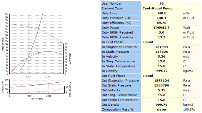 Figure 5.3 provides an overview of the pump performance. We can clearly see the duty point on the capacity curve and on the efficiency curve. The calculated results allow us to view the pump power requirement, NPSHr vs NPSHa, fluid density, duty pressure rise etc.