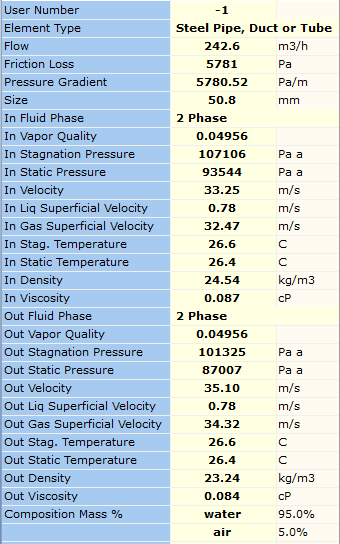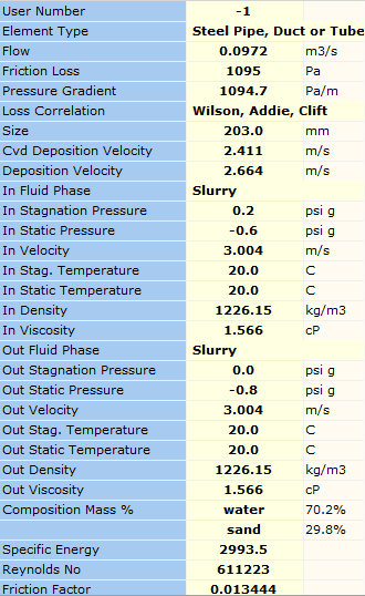 A study had previously been completed on this system by Engineering Consultants using the SRC Two-Layer Model approach. Based on historical test data available and the results of the SRC analysis, a model of the system was developed. Using the Liu Dezhong method, FluidFlow was used to analyse the system and the calculated results correlated with the SRC approach. The system was solved for a known particle distribution on the basis of a slurry concentration of 20% by weight and a total system volumetric flow rate of 41.7 m3/h. Details of the findings are outlined in the table below.