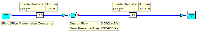 Description: Determine the pressure drop for a piping system transporting mayonnaise (power law fluid) at a flow rate of 0.002 m3/s. The mayonnaise has a behaviour flow index of n = 0.31 and K = 27.5 Pa s.