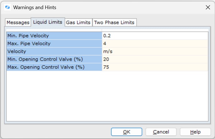 High and low velocity warnings appear based on the min and max pipe velocity limits set under Options | Warning and Hints… (see Figure 1 below). When the calculated pipeline velocity exceeds these limits, a warning message appears. You can adjust these design limits to match your specific system design parameters.