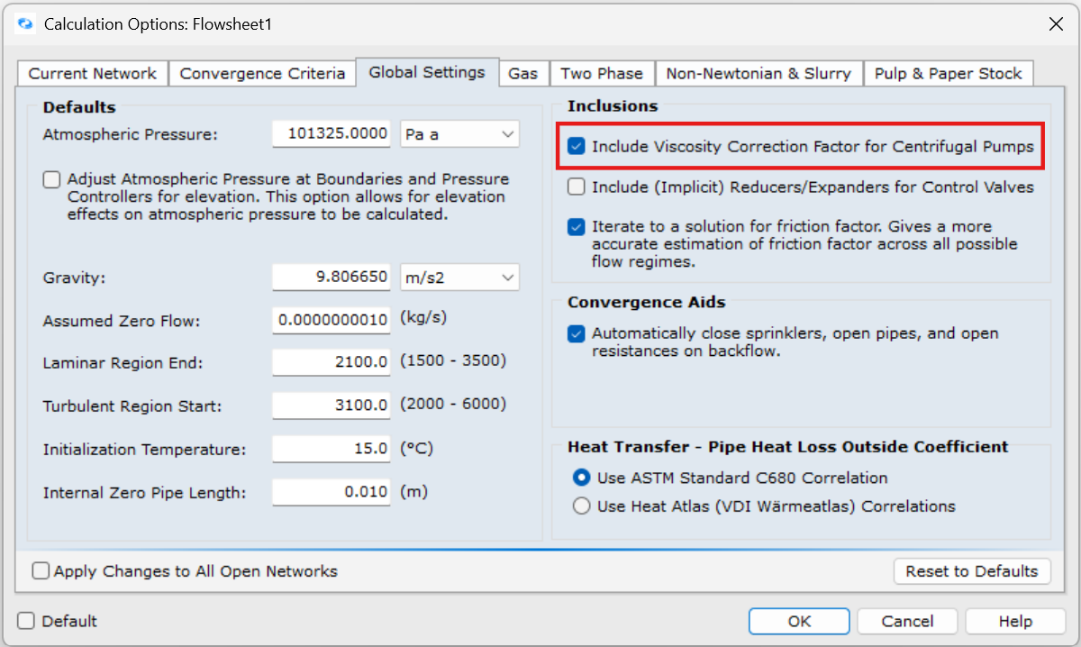 FluidFlow performs viscosity correction based on the Hydraulic Institute Standards. This correction applies only to centrifugal pumps delivering Newtonian fluids. The automatic correction occurs only when enabled in Global Settings, which can be accessed by selecting Options | Calculation | Global Settings, or alternatively, by pressing F2 and selecting Global Settings (see Figure 2 below).