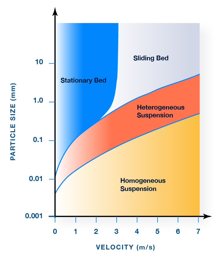 As shown in the illustration, when flow rate/velocity decreases, the flow regime transitions from pseudo-homogeneous to heterogeneous suspension (no deposition), then to sliding bed, and finally to a stationary bed/blocked pipe.